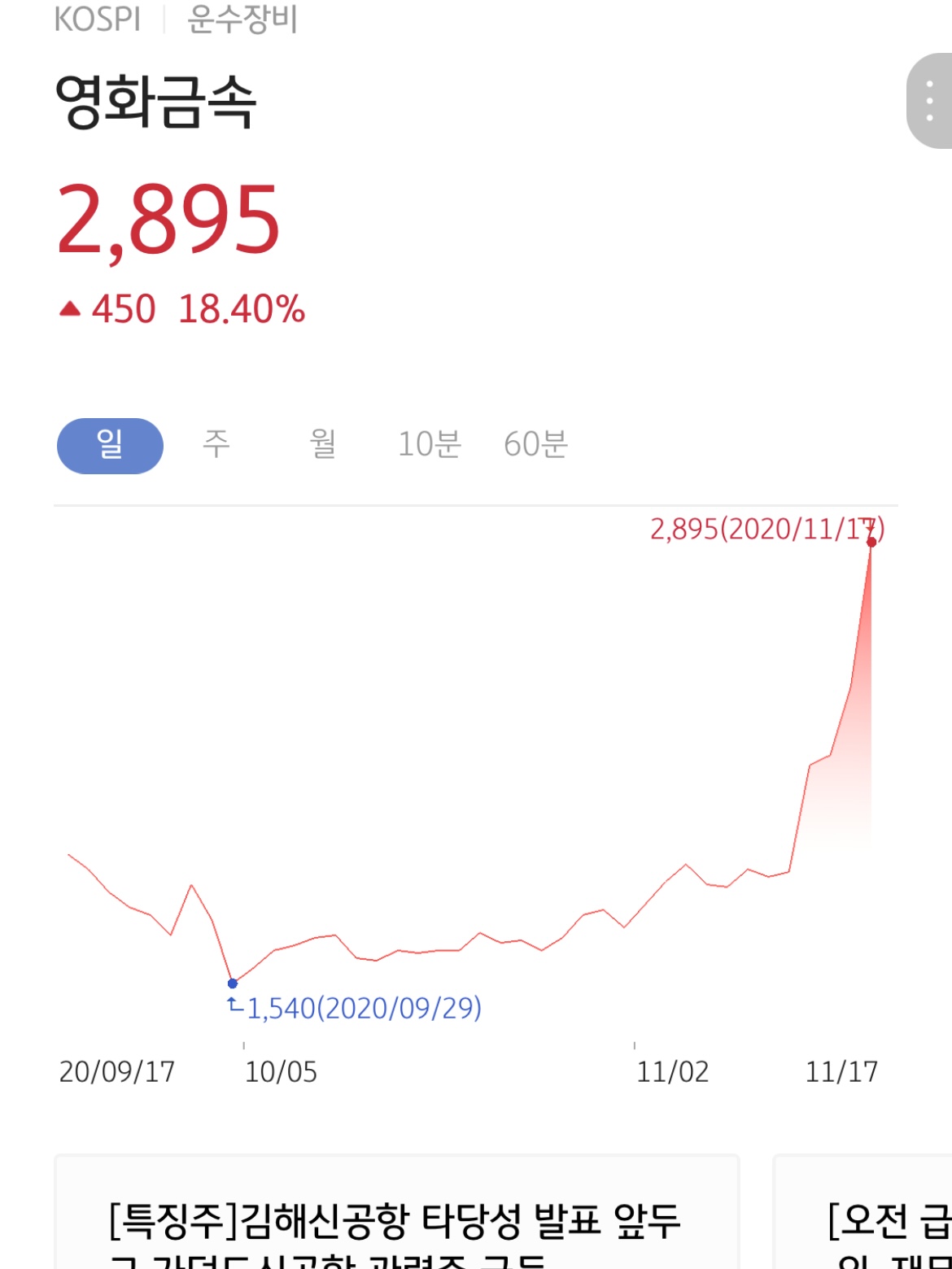 앞서 말씀드린 대로 11/17 오후 2시 김해신공항 타당성 검증 발표를 앞두고 있는 가운데, 백지화 관측 속에 가덕도 공항에 대한 기대가 급증하면서, 주식시장도 흔들리고 있습니다. 삼보산업, 영화금속, 동방선기, 엔케이와 같은 공항 소재, 제조 관련 테마주 들이 주식시장에서 강세를 보이고 있으며 발표 이후에 동향이 상당히 기대됩니다.