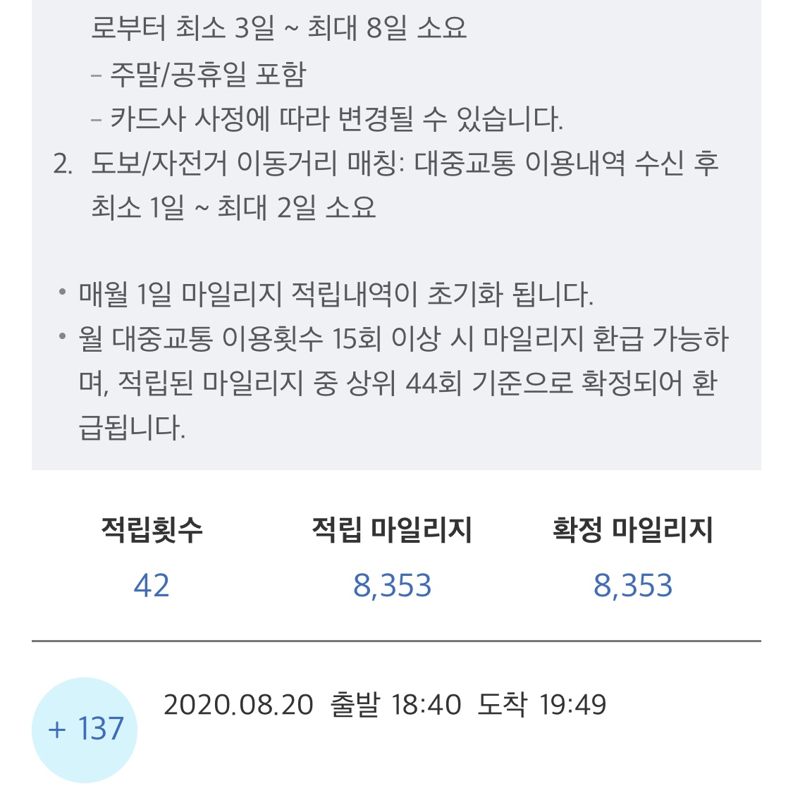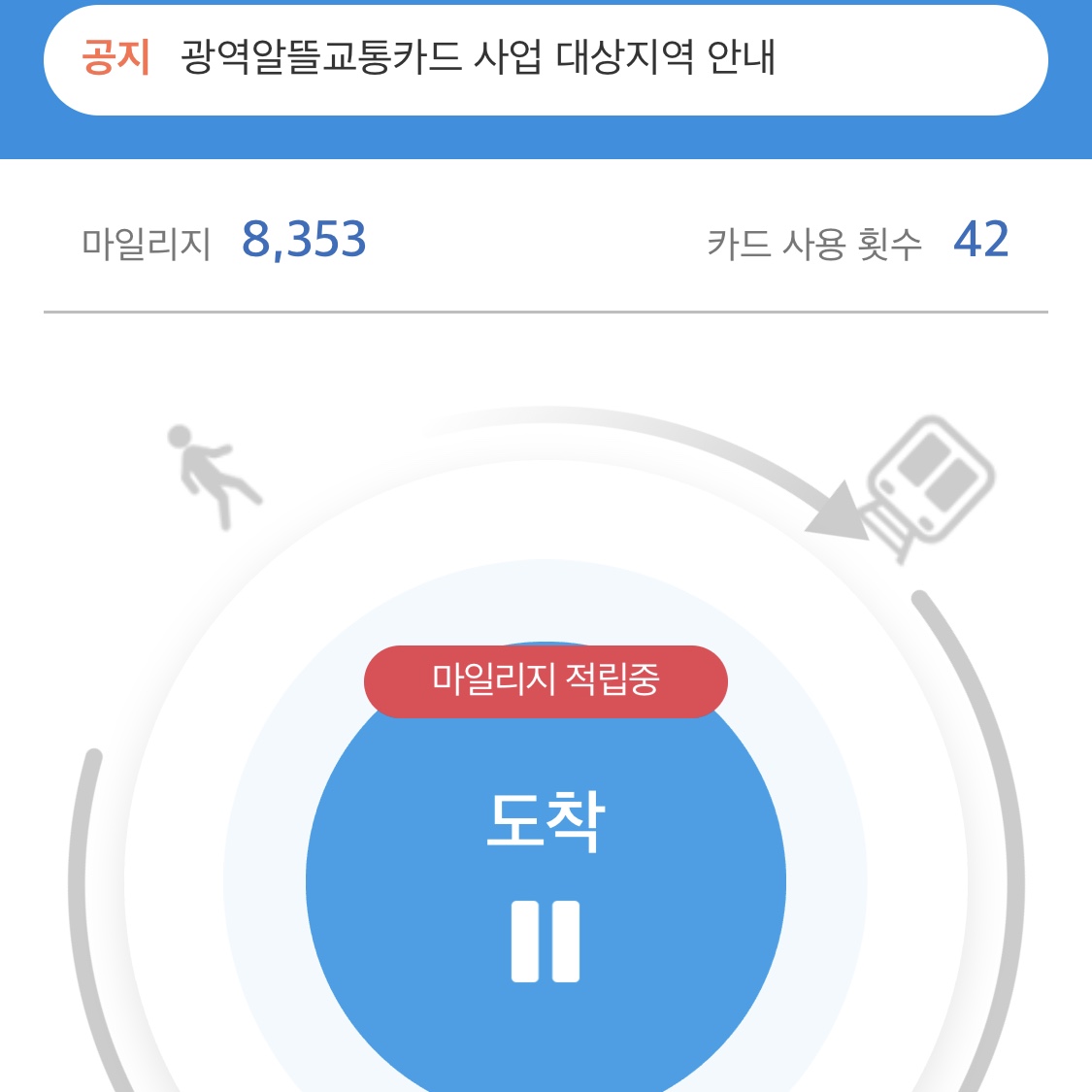 단점은 앱을 실행하고 매번 출발과 종료를 눌러줘야 한다는 것이 있는데, 조금만 습관들이다보면 어렵지 않습니다. 저도 가끔씩 출발은 자주 누르는데, 종료를 깜빡하지만 언제든지 종료버튼을 눌러줘도 되는것 같더라구요. 그래서 하차 후 집에 들어와서 누르거나 다음날 아침 출발버튼 누르기전에 활성화된 종료버튼을 누르고 다시 출발 버튼을 눌러도 적립은 잘됩니다.