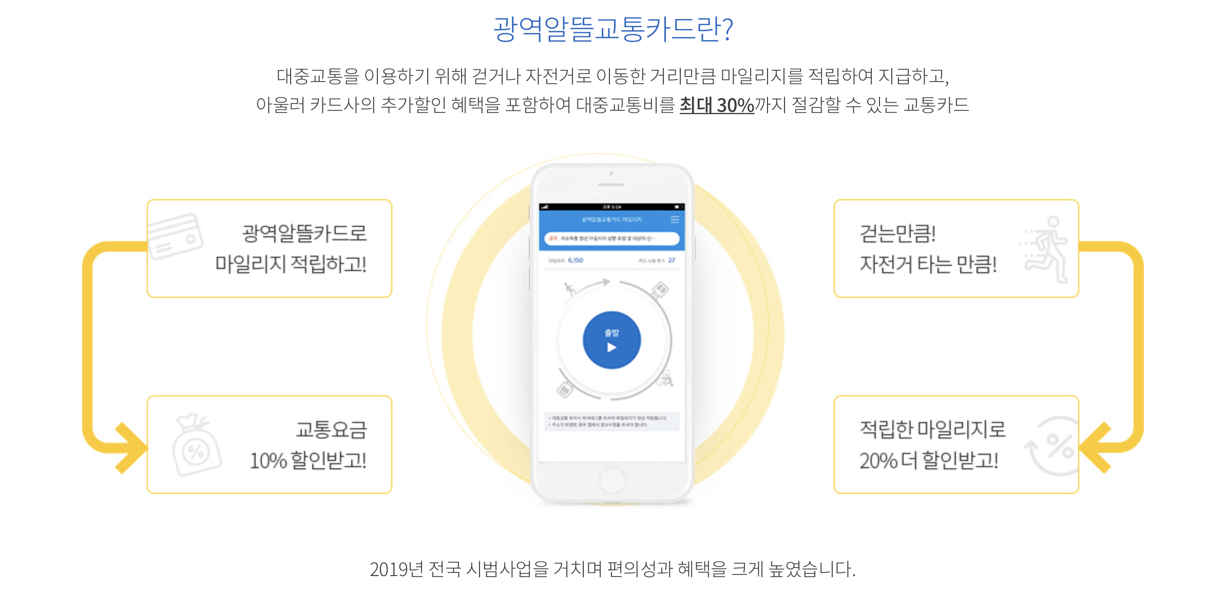 광역알뜰교통카드는 대중교통을 이용하시는 분들을 위해 만들어진 카드로 국가와 지방자치단체에서 50:50으로 비용을 부담하여 진행하는 국가 사업입니다. 이를 통해서 국가는 대중교통 이용을 장려하고 환경오염을 개선하는 취지도 가지고 있고, 이용하는 국민은 교통비를 최대 30% 이상 절감하실 수 있는 메리트가 있습니다.