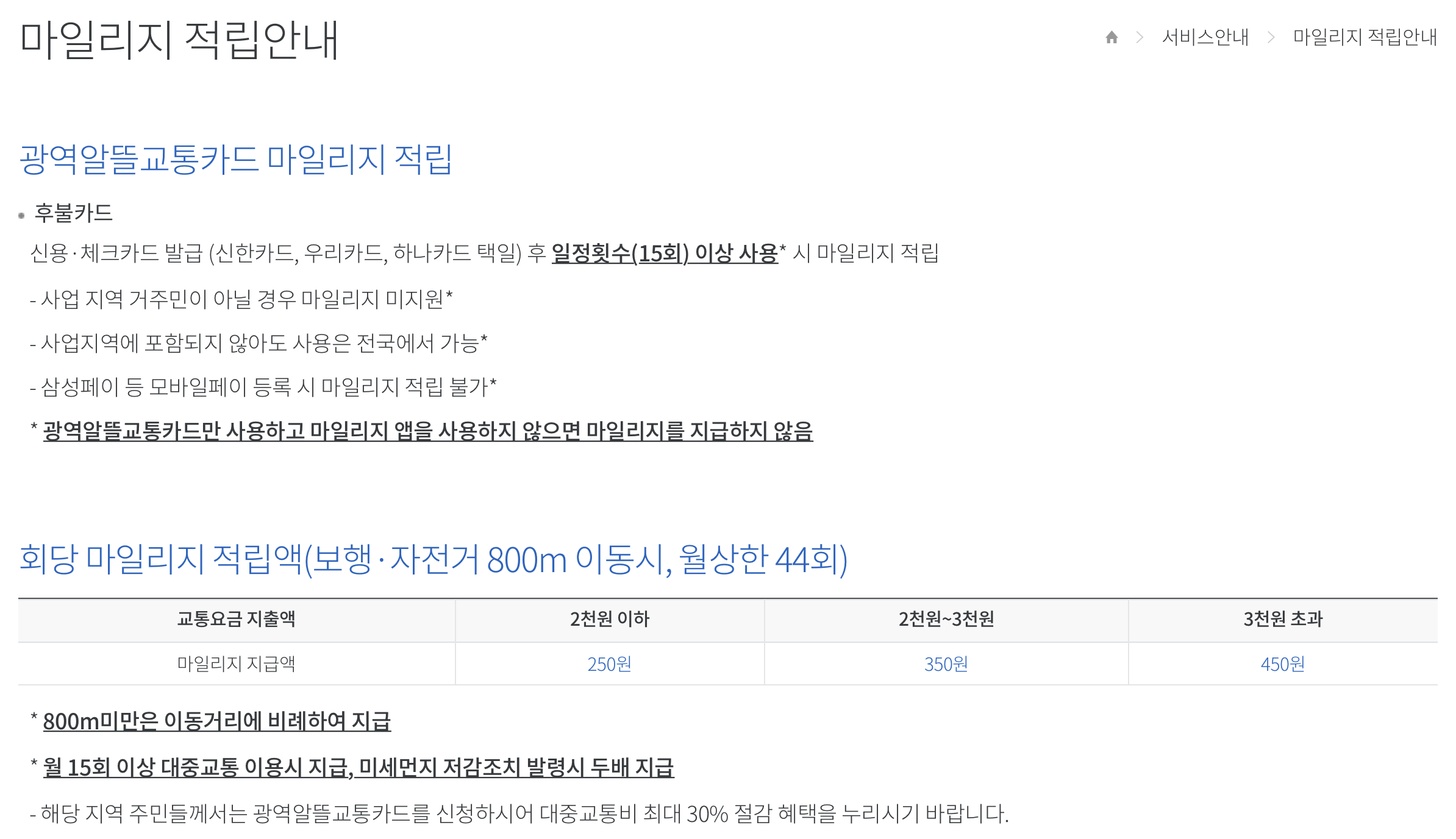 물론, 카드사마다 교통카드 외 할인혜택들이 상이 하니 본인이 원하시는 혜택에 맞춰서 신청하여 사용하시는것이 가장 좋을것 같습니다. 이러한 혜택을 기본적으로 우리는 광역알뜰교통카드 앱을 통해서 적립한 마일리지를 통해서 추가 할인이 가능합니다. 이전에는 교통비 할인을 최대로 받기 위해서는 정기권이 가장 큰 메리트였는데, 사용횟수에 따라 정기권보다 할인폭이 큽니다.