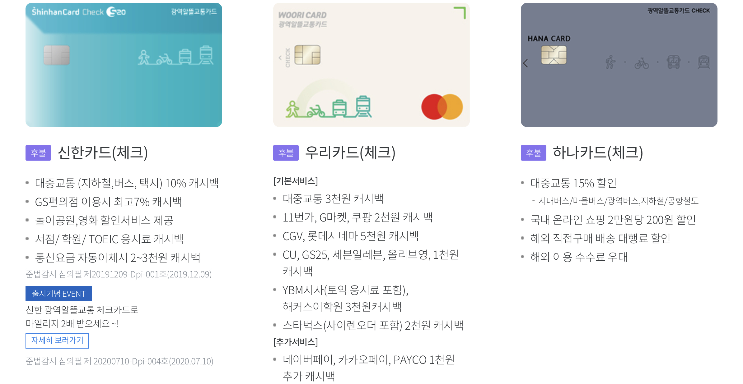 제 경우에는 주로 쓰는 신용카드가 있어서 따로 신용카드는 만들기 부담스러워, 우리 체크카드를 신청하여 사용하고 있습니다. 물론 신용카드가 체크카드 보다 교통비의 할인혜택이 더 큽니다. 신용카드/체크카드 모두 하나카드가 20%, 15% 할인 혜택을 기본적으로 제공하고 있습니다. (물론, 전월실적을 채워야 한다는 조건이 있습니다.)