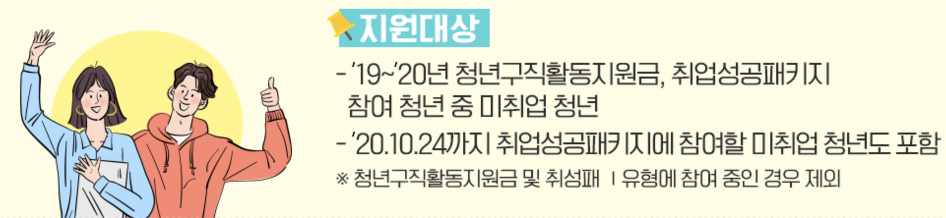 - 대상: 1️⃣ 2019년~2020년 청년구직활동지원금, 취업성공패키지 참여 청년 중 미취업 청년. 2️⃣ 2020년 10월 24일까지 취업성공패키지에 참여할 미취업 청년도 포함 (단, 청년구직활동지원금 및 취성패 I 유형에 참여 중인 경우 제외)