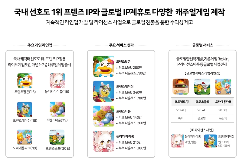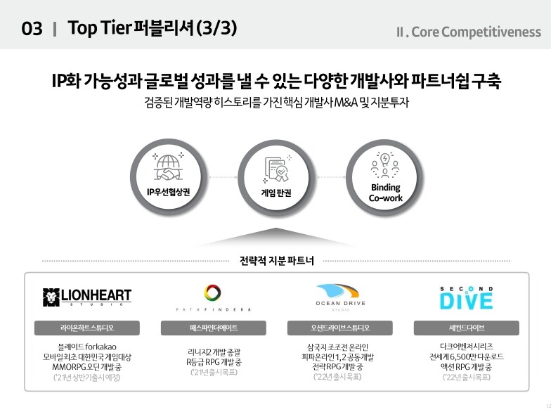 -개발력 확보를 위해 지분투자를 지속적으로 실행. 역량확보를 위해 카카오게임즈는 IP화가 가능하고 글로벌적으로 성과를 낼 수 있는 회사들을 발굴하는것에 아낌이 없는것 같습니다. 이 와 관련된 국내 개발사 (오션드라이브스튜디오, 패스파인더에디트, 세컨드드라이브 등)에 지분 투자하여 카카오게임즈의 향후 원동력에도 힘을 쏟고있습니다.