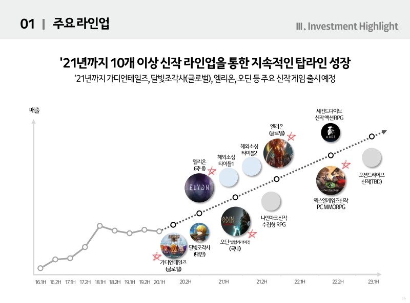 - 상장이후 2021년까지 10개 이상의 신작 라인업을 통한 지속 성장 예상. 2020년 연말에 출시 예정인 기대작 "엘리온"과 내년에 출시 예정인 "오딘"이 있으며 오딘의 경우는 모바일MMORPG 이지만 PC로도 지원하여 폭넓은 환경에서 게임을 즐길 수 있도록 제공할 것이라고 하네요.