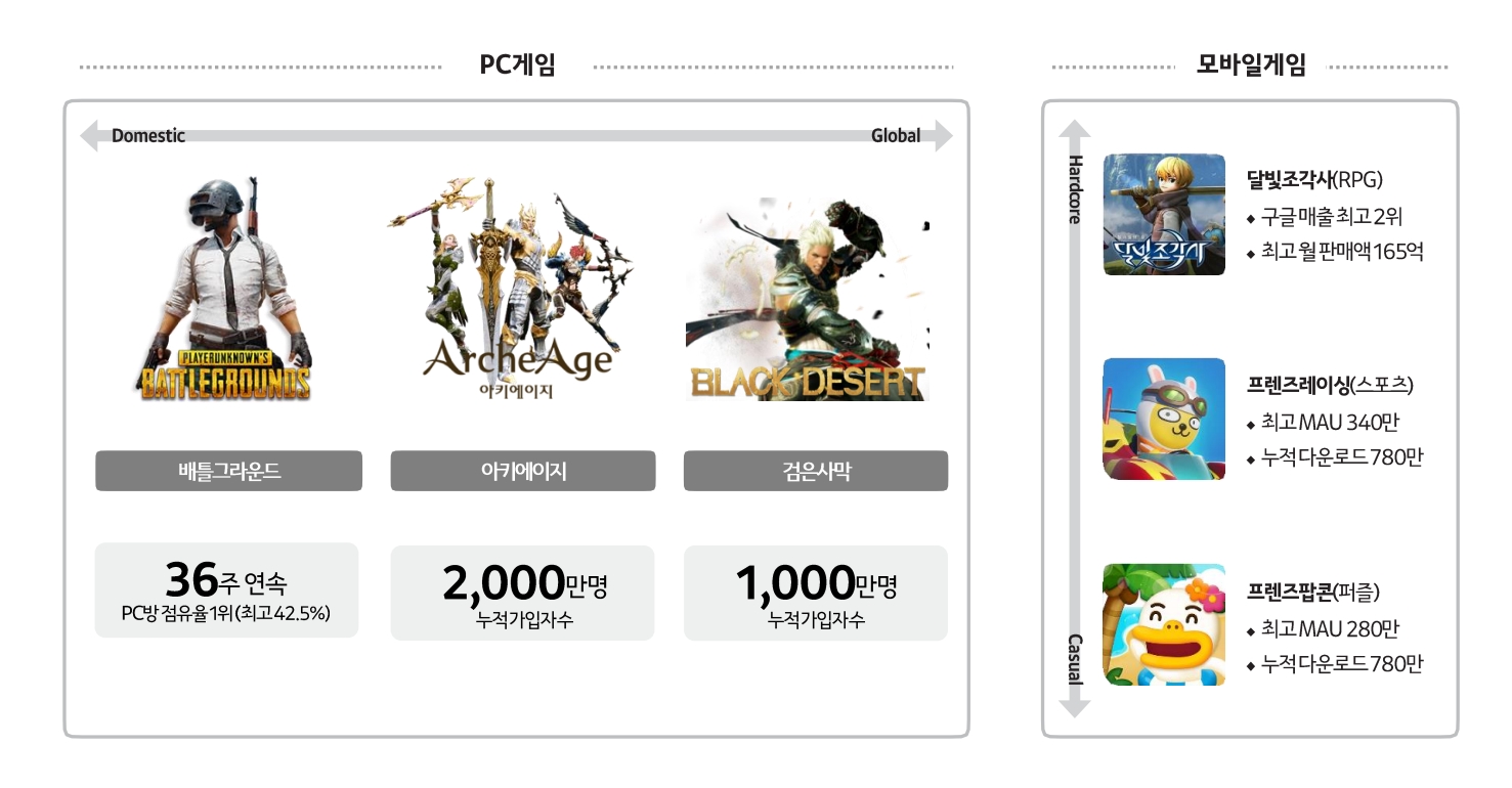 카카오게임즈는 카카오의 지분율이 59%를 차지하고 있는 회사입니다. 일단, 실적을 두고 보면 확실히 가빠르게 성장하고 있는 회사임에는 틀림이 없는데요. 그런데, 배틀그라운드가 하향세를 보이고 있는것도 있고 다른 게임라인업이 빈약하다는 소리가 많았던것도 사실입니다.