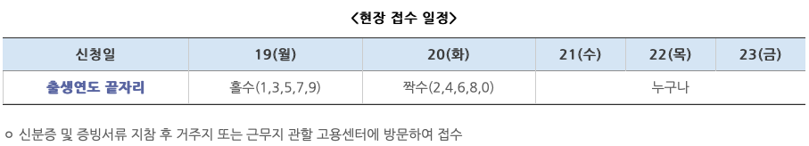 - 단, 현장접수에 한하여 접수자 집중으로 인한 민원발생을 예방하고자 홀짝제로 운영됩니다.